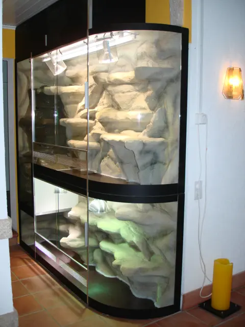 Bogenglasterrarium 2185x550x2150, 2-Teilig, oben Regenwald mit Wasserfall und Aquarium, unten Wüstenteil. Ausgestattet mit Felsenwand Var.2, Beleuchtung, Eheim Thermofilter und Beregnungsanlage.
