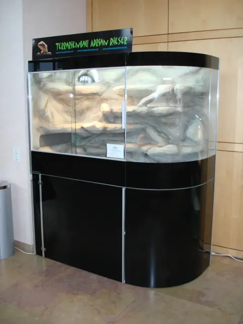 Bogenglasterrarium 1500x700x1000, mit Unterbaumöbel aus Glas, schwarz glänzend, 800mm hoch. Rückwand und linke Seite Var. 2. Inkl. T5- und UV-Beleuchtung