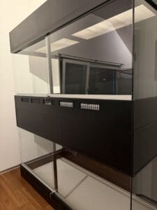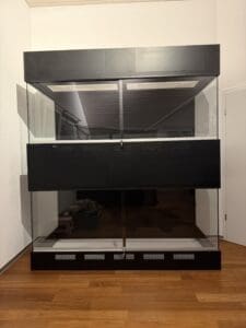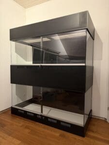 Terrarienturm mit zwei Forex-Rapid Terrarien, 200x90x90cm Innenmasse, mit Lampenkästen zum öffnen, alles schwarz lackiert
